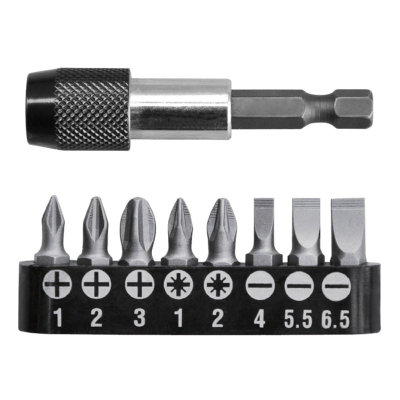 Στη συσκευασία περιέχονται: 1 τεμάχιο αυτόματος μαγνητικός αντάπτορας, 8 τεμάχια μύτες SL4, SL5.5, SL6.5, PH1, PH2, PH3, PZ1, PZ2